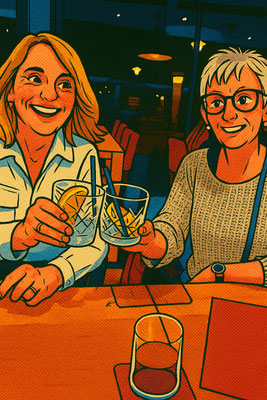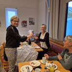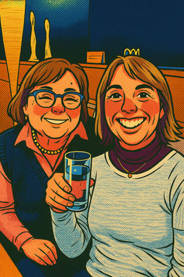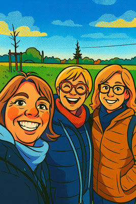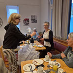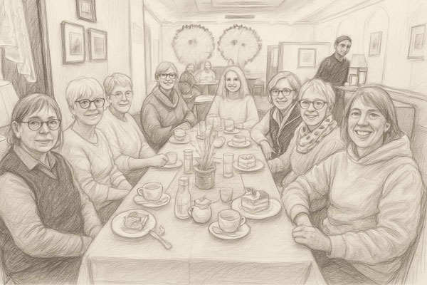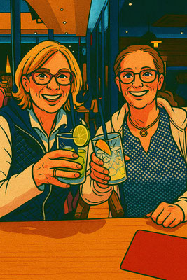 Am Abend wartete dann das „Ristorante Teatro“ am Markt auf uns. In stilvollem Ambiente verwöhnten uns italienische Spezialitäten und das unvergleichliche Gefühl, einfach mal entspannt und im Austausch mit tollen Frauen den Abend genießen zu können. Gute Gespräche aber auch herzhaftes Lachen und ein Hauch von Dolce Vita machten den Abend perfekt. Auch die hessische Mundart („ …, du bist e fresch Mensch …“, oder Strickanleitungen fanden den Weg zu den entsprechenden Empfängerinnen! Am Rande wurden einige Fotos von den „Expertinnen“ unter uns mit Hilfe von KI bearbeitet und so konnten wir uns -unter ordentlichem Gelächter- als Comic-Figuren bewundern! Einfach herrlich!